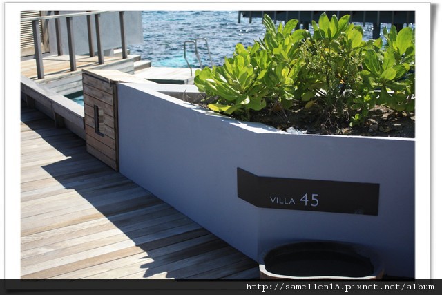 ▽ 我們的 aqua villa, villa 45 它是整排水上屋, 大概是中間的位置, 在 tripadvisor 爬了好久的文章, 住過的都推薦這間, 所以呢, 早早就 mail給 Alila, 請他們幫我保留此房給我們, 如不行也得在前後的 villa. 為什麼非得這間呢? 住進就知了...
