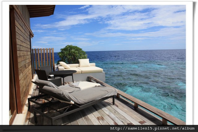 ▽ sundeck 也是我們最愛的場所, 與大海零距離, 不用下海 就可看到比 海生館更豐富的 珊瑚 及 熱帶魚 ( 這就是為什麼 要指定 villa 45的原因了, 因為它 下面,前面都是珊瑚礁 隨時都熱帶魚一堆, 如果住太前面 靠近沙灘的前幾間, 珊瑚只有零星的幾叢, 如果住太後面 浪好像又大了點, 所以啦, 個人覺得 villa 43 到 46, 這幾間的 view是最好的.)