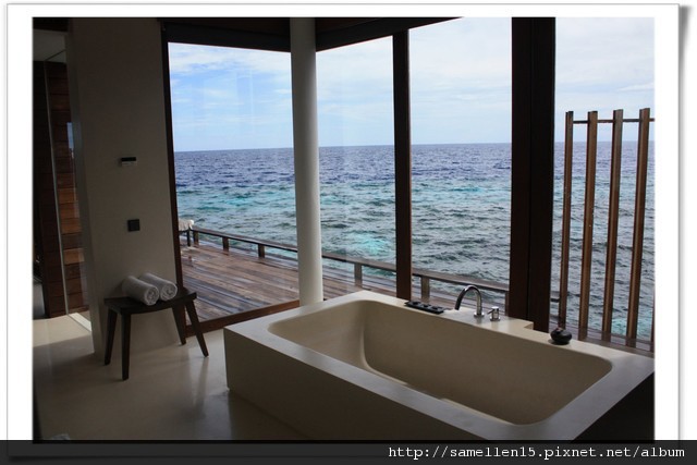 ▽這是浴室 也是超棒的, 180度的落地窗 讓你泡澡 也能欣賞大海, 不浪費 你一分一秒. 而且一進浴室就聞到似有似無的精油味, 味道剛好, 原來 Shifaz 早在之前就點了薰香精油了.
