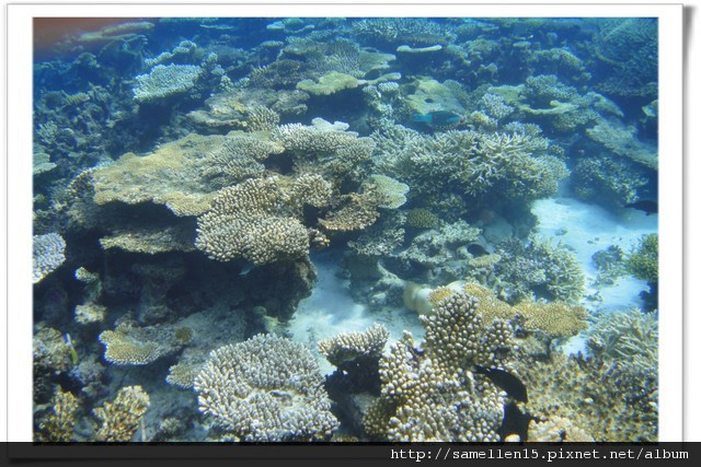 這次的浮潛 是從 Arrival Jetty 下去的, 一下去不得了了, 這裡的水深 比 Aqua Villa前的深, 所以珊瑚又多又大, 而且魚種也多很多, 小黑 一路帶我們往前游, 一直游到 珊瑚礁懸堐處 ( the edge of coral reef ), 再來我們就沿著那交界處 一路往 Aqua Villa 的方向游去...