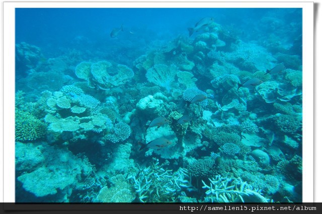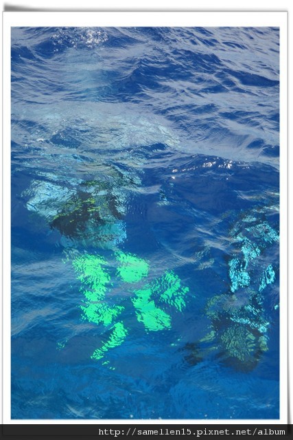 ▽ 你看 另一邊的藍 色澤越深, 表示那裡就更深了, 但那邊的魚群更多了 你看 那一點一點的都是魚吔, 但是 怕怕吔!