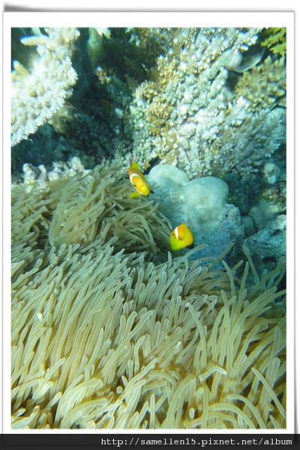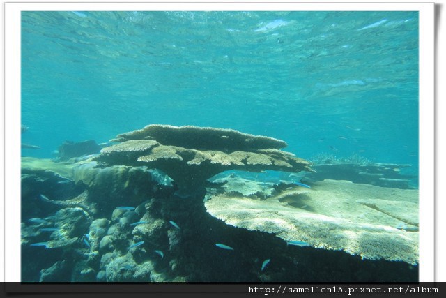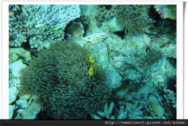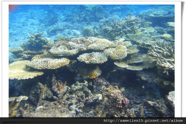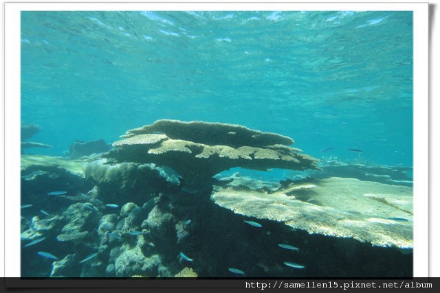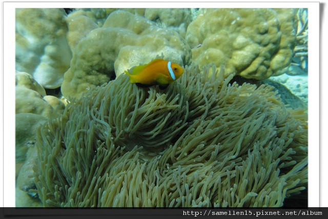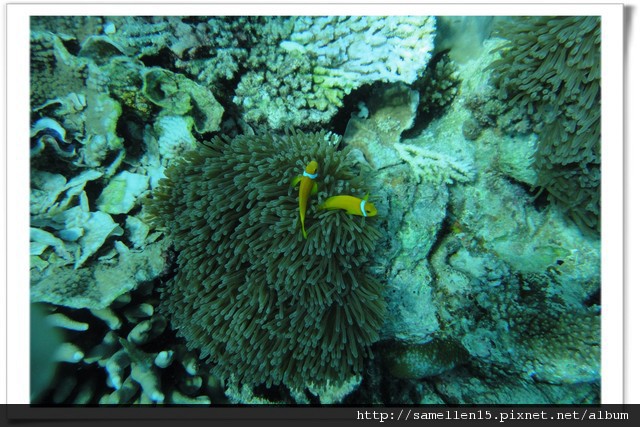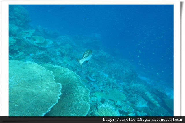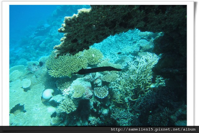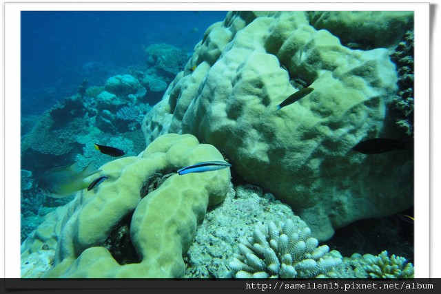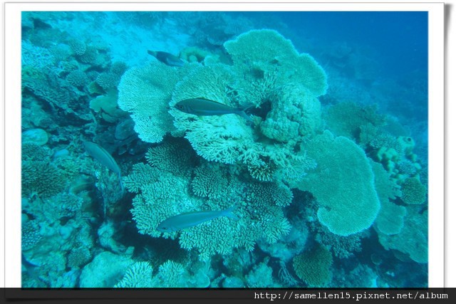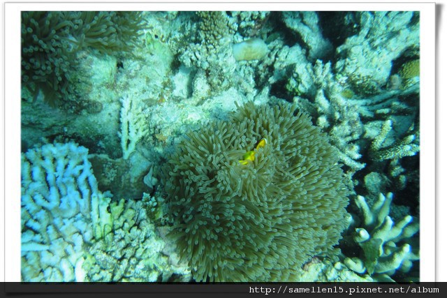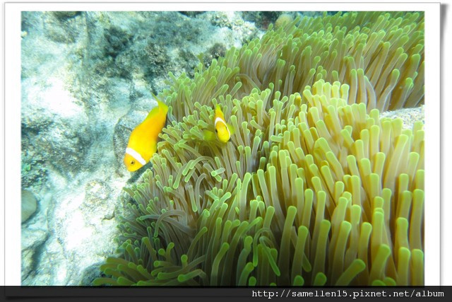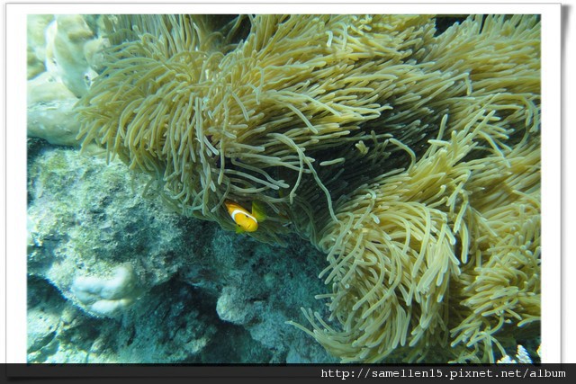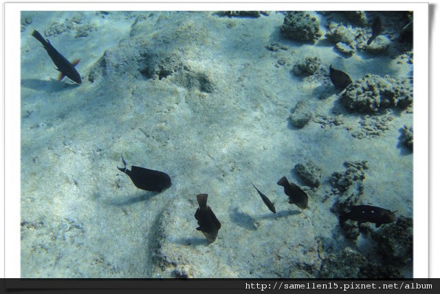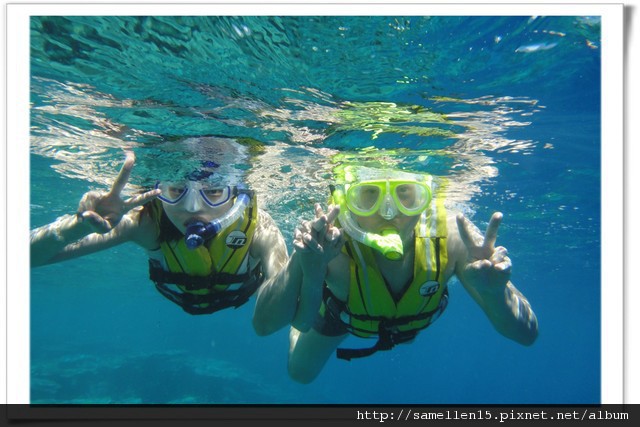 就這樣 我們兩個人 一路緊張到下水的那刻, 當我們看到水下的景色時, 其實也沒那麼害怕 那麼緊張, 而且我們有覺得小黑教練真的一路上都有在注意我們哦, 也因為這樣 我們才能盡情地在這水中花園遊玩, 而且 小黑教練如果看到什麼新奇的東西 都會指給我們看. ( 當然 Ellen 跟我 是一路手牽手, 互相注意彼此是否有狀況, 隔個幾分鐘, 就比個手勢,以確定 O 不 OK, 在不確定的環境下 一切小心為上策.) ( 而且我們這一次是大成功喔, 因為全程我們都沒喝到海水吔!)