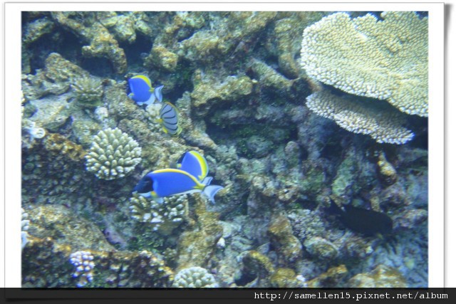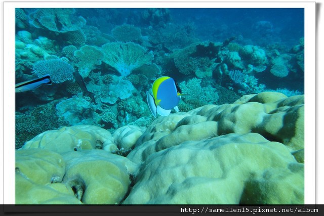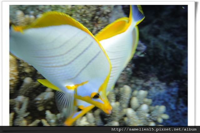 ▽ 還有這 白的發亮 的蝶魚, 總是倆倆成對地游在一起. ( 看起來就很健康的樣, 不像在 水族專賣店的 暗淡...)
