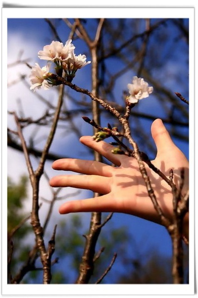 背景模糊的藍天白雲配上鮮明的手掌與白花,