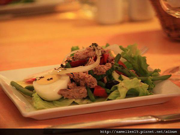 沙拉是 尼斯沙拉, 跟在尼斯當地吃的 風味又有點不一樣, 鹹鯷魚 這裡換成了鮪魚.