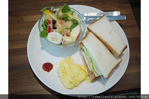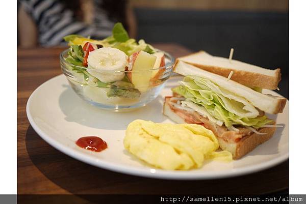 第五樂章 精選三明治餐 --- 內容是 生菜沙拉, 蛋 及 三明治 ( 法式洋蔥鮭魚; 法式獵戶豬肉 二選一 ), 今天我選 法式洋蔥鮭魚.