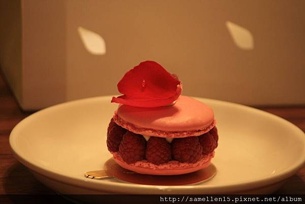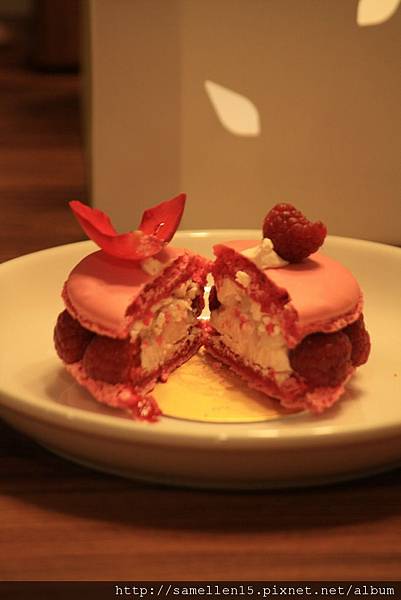 ISPAHAN --- PIERRE HERME 的得意之作 , Ispahan 是一種玫瑰的品種, 這有點像小漢堡的大型馬卡洪, 既然以 Ispahan為名 想當然是以玫瑰口味為主, 最明顯的就是那玫瑰花瓣, 而且又點綴著一滴露水(應該是糖漿吧), 看起來就很新鮮可口的樣子; 再來就是那兩片 像是圍著芭蕾舞裙的小薄餅. 小薄餅中間佈滿 玫瑰口味的奶油 及你想像不到的 --- 荔枝果粒; 周圍再圍著一圈 似紅寶石般的 覆盆子.